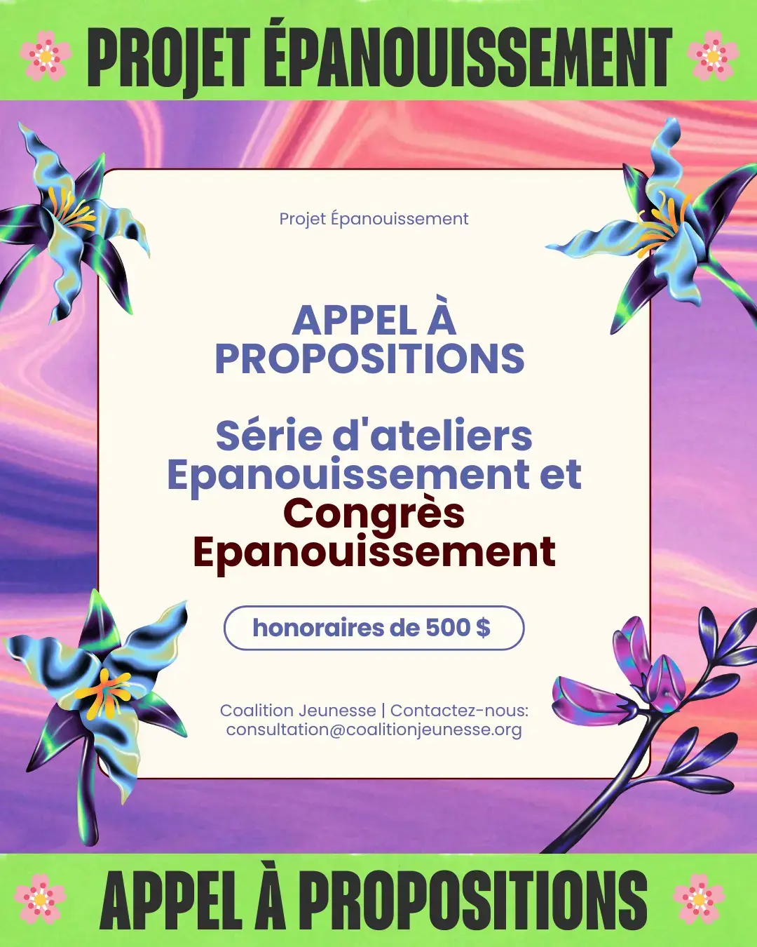 Coalition Jeunesse is strengthening collaborations among 2SLGBTQ+ and community organizations across Québec to build solidarity and collective power. We’re looking for workshops that deepen our connections through creativity, care, and community learning.